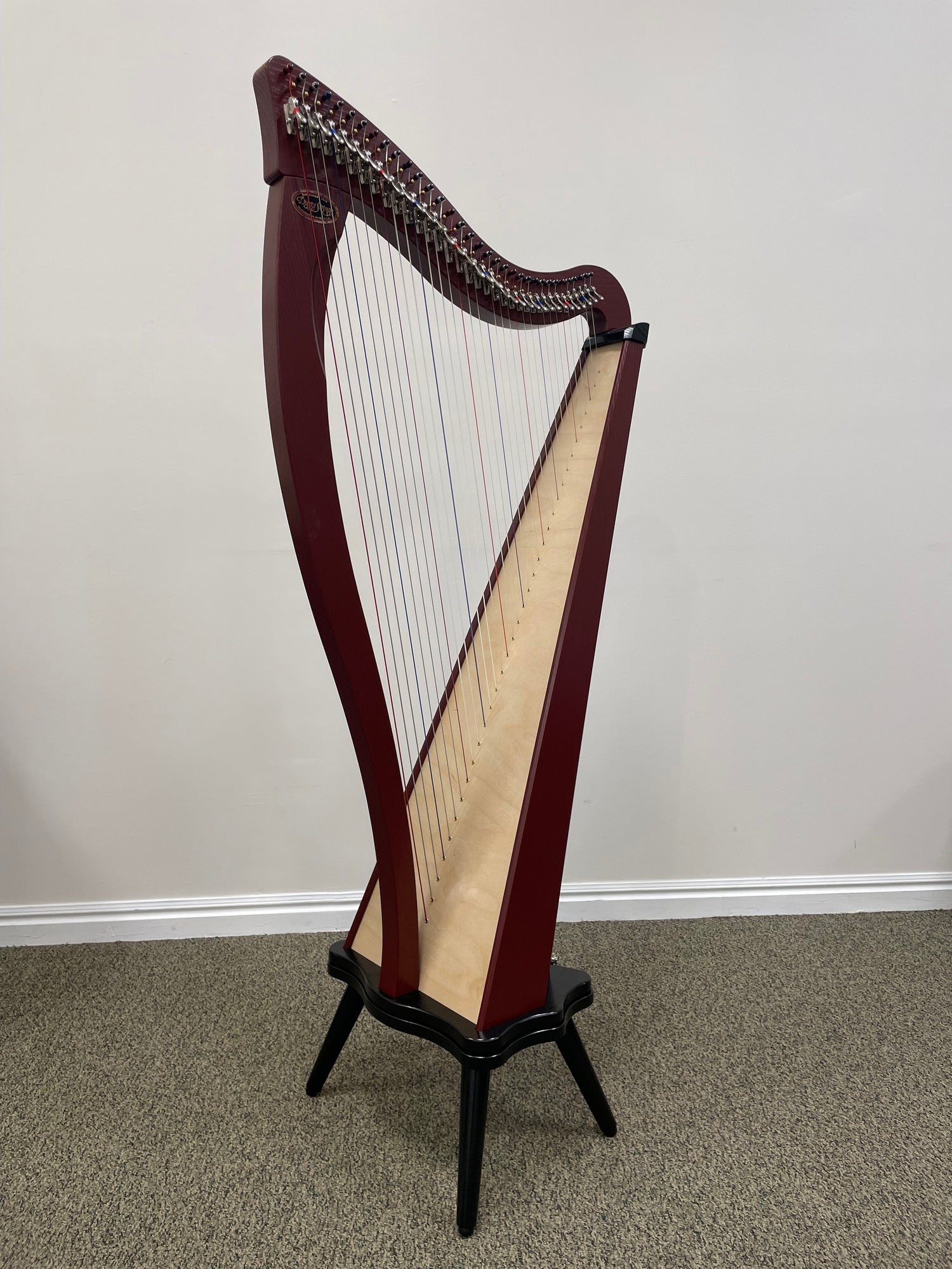 "This Ravenna comes in a gorgeous burgundy finish. Its 34 nylon and wire strings are at a looser tension than most other harps, making it easy to produce a louder, more beautiful sound. It is an ideal choice for a beginning harp student or folk musician. This harp also comes with a pickup already installed, for harpists who want to play amplified. #24846