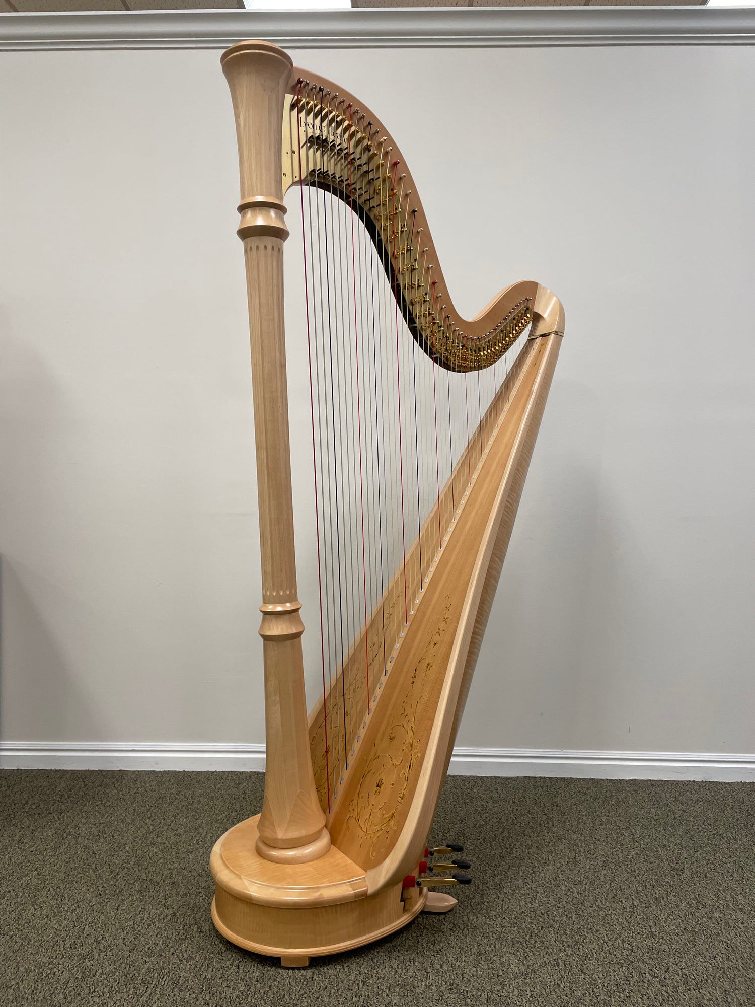 The Lyon & Healy 85CG is a harp with a classic sound and a contemporary look. It was a warm, full tone, capable of filling a concert hall. The 85 is a professional level harp, making this a great instrument for an advanced student looking for their first pedal harp or for the seasoned musician. This harp comes in a natural finish, with a sitka spruce soundboard. It comes with travel and dust covers, bench, dolly, and tuning key.